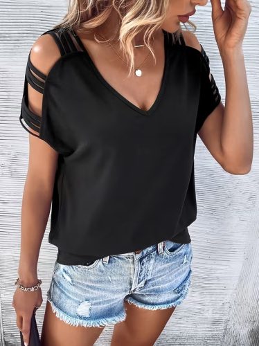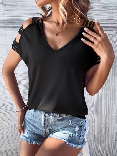 • Kadın kısa kollu v yakalı şerit detaylı viskon bluz